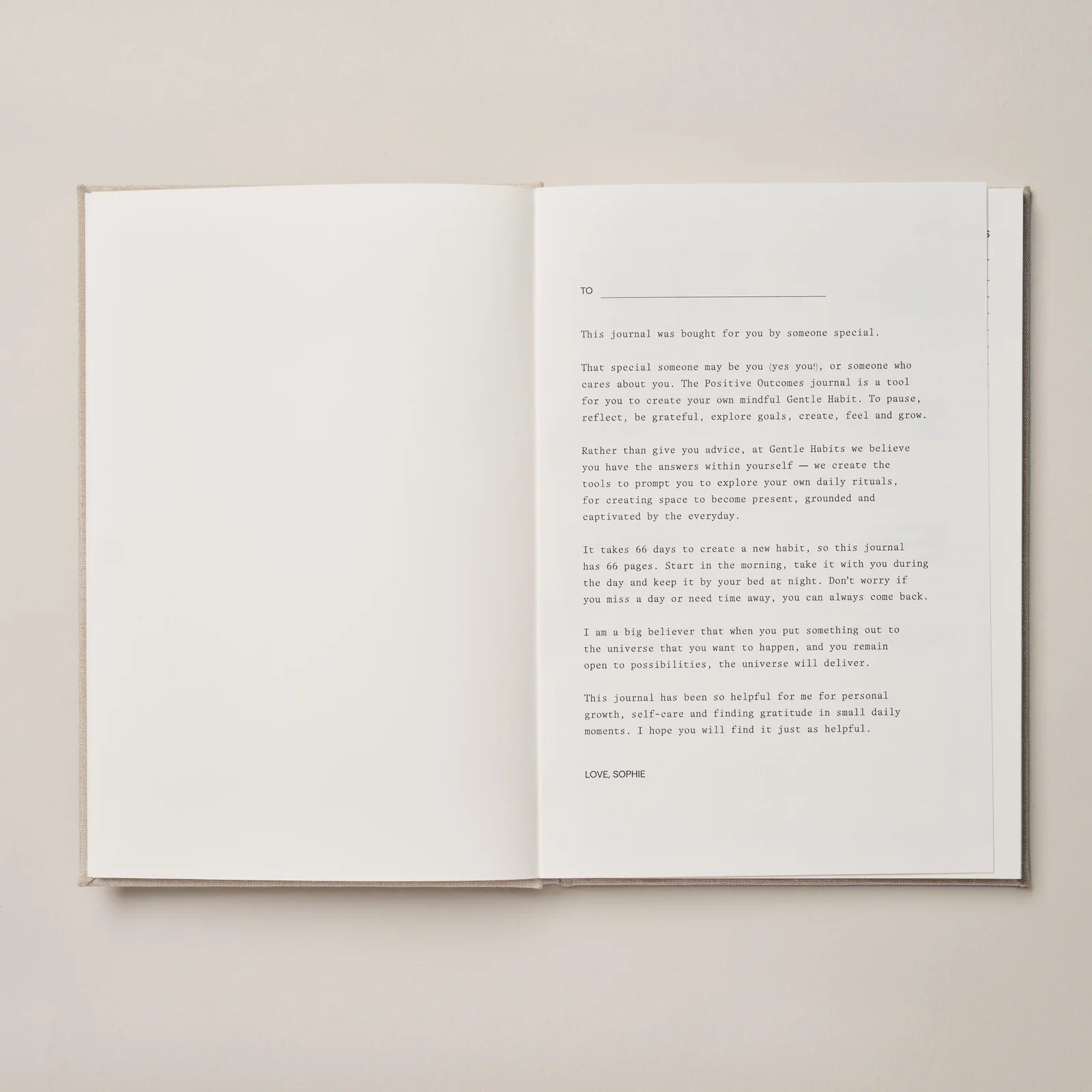 It takes 66 days to create a new habit, we have created this journal to have 66 pages. The Positive Outcomes Journal is a tool for you to create your own mindful Gentle Habit. To pause, reflect, be grateful, explore goals, create, feel and grow.